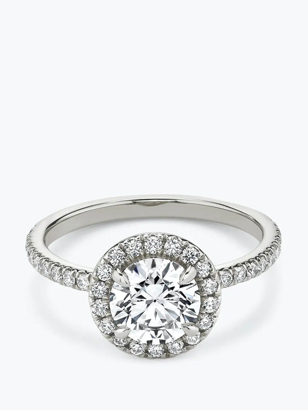 1.5ct  w/ Shoulder Stones and Halo  CENTRE DIAMOND Sustainably created, IGI certified and laser inscribed Shape  Round Brilliant  Carat Weight  1.51 Carats  Colour Grade  D Clarity Grade  VS2 Cut Grade  Excellent Polish  Excellent Symmetry  Excellent    SHOULDER & HALO STONES Number ...