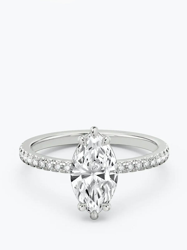 1ct Marquise Cut w/ Pave Shoulders  CENTRE DIAMOND Sustainably created, IGI certified and laser inscribed Shape  Marquise Carat Weight  1.08 Colour Grade  E Clarity Grade  VS1   SHOULDER STONES Number  16 Size  1.3mm  Colour Grade  E - F  Clarity Grade ...