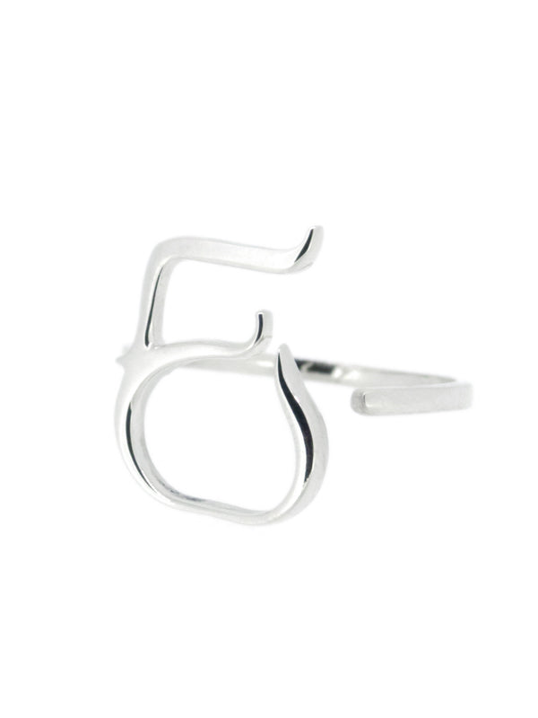 E Letter ring with customised font by tyopgrapher, Paul Nolan.  Adjustable band to accommodate all finger sizes. 925 Sterling Silver 1.8cm in height Arrives within 10 days.  Crafted in Australia.